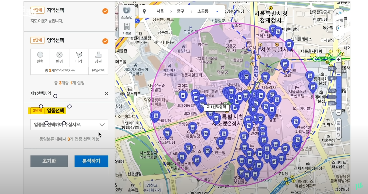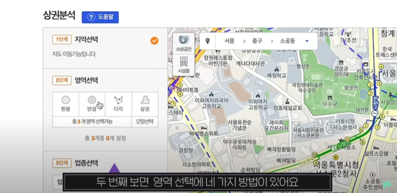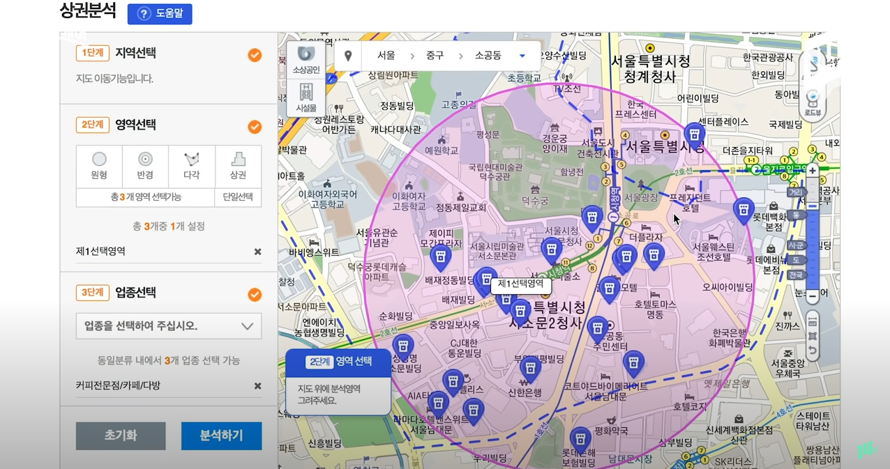 1단계로 지역을 선택해야 하는데, 편의상 기본 지도 화면에 보이는 서울시청 근처에 카페를 개업한다고 가정해보겠습니다. 2단계는 영역 선택인데 여기서는 반경으로 선택해보겠습니다. 보통 500m 정도 선택합니다.
