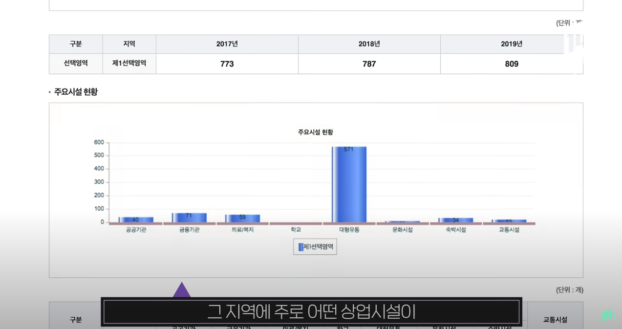 또, 지역 분석란을 통해 그 지역에 주로 어떤 상업시설이 존재하는지도 살펴볼 수 있습니다.