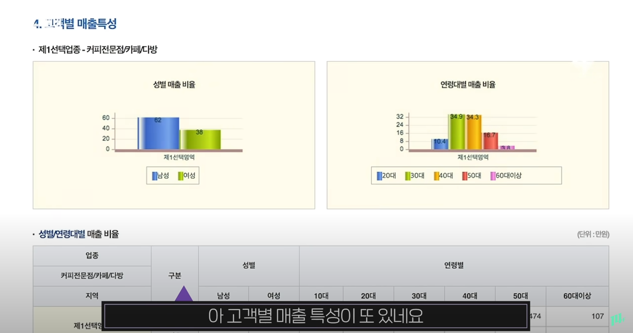 게다가 고객별 매출 특성도 볼 수 있는데, 성별로는 남성(결제하는 사람 기준)이 62%에 달하고 연령대는 30대와 40대가 가장 많다는 점도 파악할 수 있습니다.