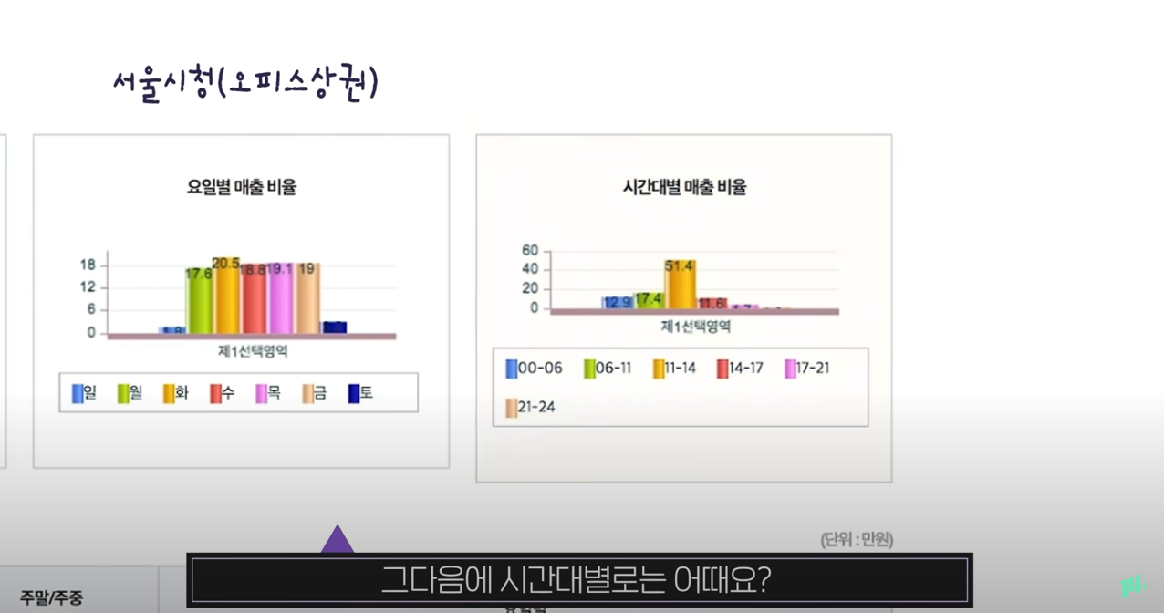 그리고 매출액 항목에서 꼭 확인해야 할 부분이 요일별, 시간대별 매출입니다. 현재 분석 지역이 시청이라 오피스 상권에 해당되므로 토, 일요일 매출이 거의 없고, 51%의 매출액이 점심시간에 발생한다는 사실을 발견할 수 있습니다.