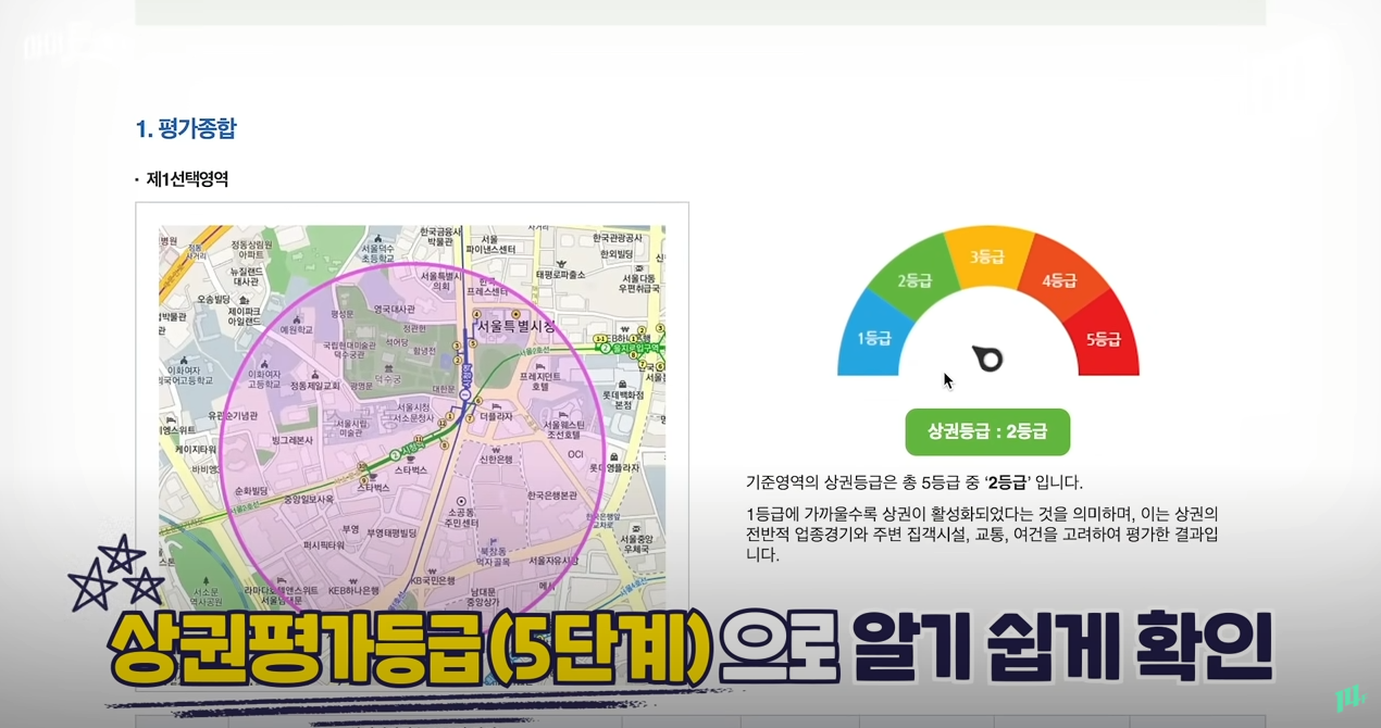 이제 평균, 시간대별, 요일별 매출액 등 다양한 상권분석 정보를 확인할 수 있습니다. 먼저 상권분석 보고서의 상권 평가란을 보면, 선택한 지역이 상권 평가등급(5단계) 중 몇 등급인지 알 수 있습니다.